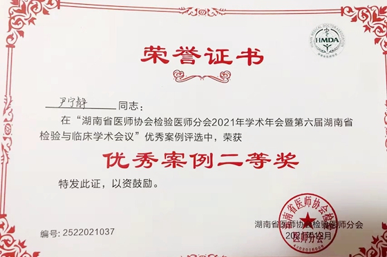 12月3-5日,由湖南省医师协会、湖南省医师协会检验医师分会、中南大学湘雅医院承办的湖南省医师协会2021年检验医师年会暨第六届湖南省检验与临床学术会议在长沙召开。会上进行了优秀论文、临床案例的汇报和评选,湘雅常德医院检验科尹宁静老师荣获优秀案例二等奖的好成绩。