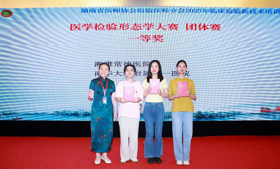 6月14日,湖南省医师协会检验医师分会2025年医学检验形态学竞赛在省会长沙举行。湘雅常德医院检验科高夏秋、文晨、姚妍伶团队凭借过硬的专业素养和敏锐的形态辨识能力,以总分全省第二名的成绩勇夺团体一等奖,高夏秋、文晨分获个人单项奖二等奖。