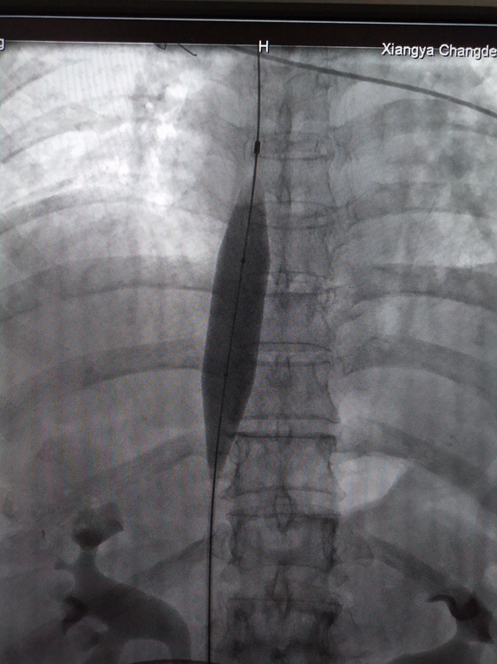 3月25日,在放射介入科主任胡康新教授的指导下,汤金城医师、李毅副主任医师和黄彬副主任医师为患者实施介入治疗。手术在DSA引导下,医生先经股静脉置管进行造影,明确诊断并确定了病变类型,观察下腔静脉的狭窄程度和梗阻远端有无血栓以及肝静脉是否通畅。随后从右颈静脉插入另一导管,经上腔静脉和右心房导入下腔静脉上端,两根导管同时注入造影剂,以便更清楚的了解病变长度。在明确了病情后,医生再经导丝插入球囊扩展导管置狭窄处,经反复扩张后,直至球囊完全张开。扩张后,植入内径合适的“Z”形支架。手术仅历时一个半小时,手术顺利完成,病人安返病房。