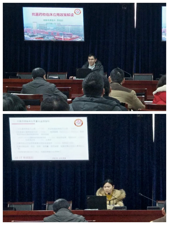 会上,我院质控部谢驾龙对抗菌药物管理政策进行了全方面、细致的解读,主要对抗菌药物不合理使用的危害、重点抗菌药物临床应用管理、重点监控环节等内容进行了专题分享。随后我院药剂科临床药师曾柳以“2018年湘雅常德医院抗菌药物临床应用与分析”为题,详细介绍了我院抗菌药物临床使用、围术期抗菌药物预防性应用、抗菌药物监测等实际情况,