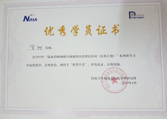 2019年4月17日至21日,由国家卫生健康委医院管理研究所组织开展的临床药师细菌真菌感染诊治理论培训项目(培英计划)第七期培训班在杭州顺利开幕。国内知名抗感染专家、临床微生物和临床药理学专家等亲临授课,有浙江大学医学院附属邵逸夫医院俞云松教授、中国医科大学第一医院陈佰义教授、复旦大学附属华山医院抗生素研究所杨帆教授等。湘雅常德医院抗感染临床药师曾柳参加了此次培训班,荣获“优秀学员”称号。