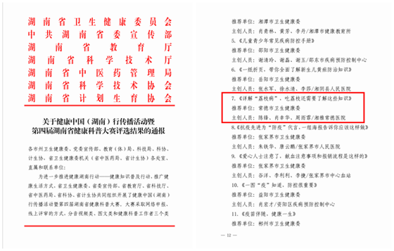 为进一步推进健康中国行动——健康知识普及行动,普及健康科学知识,推广文明健康的生活方式,2021年9月,省卫生健康委、省委宣传部、省教育厅、省科技厅等共同组织开展了“健康中国(湖南)行传播活动暨第四届湖南省健康科普大赛”。我院积极组织作品上报工作。