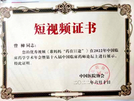 湘雅常德医院药剂科曾柳选送的题为《准妈妈“药在囧途”》的短视频作品在参赛的众多作品中冲出重围,入选优秀视频作品并于年会暨论坛“大会风采”上展示。