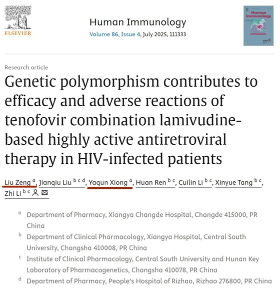 6月3日,湘雅常德医院药剂科团队在国际知名学术期刊《Human Immunology》(JCR Q3区,IF:3.1)上发表了一篇题为《Genetic Polymorphism Contributes to Efficacy and Adverse Reactions of Tenofovir Combination Lamivudine-Based Highly Active Antiretroviral Therapy in HIV-Infected Patients》的研究论文。药剂科曾柳为第一作者,熊亚群为第三作者,中南大学湘雅医院临床药理研究所李智教授为通讯作者,湘雅常德医院药剂科为第一署名单位。