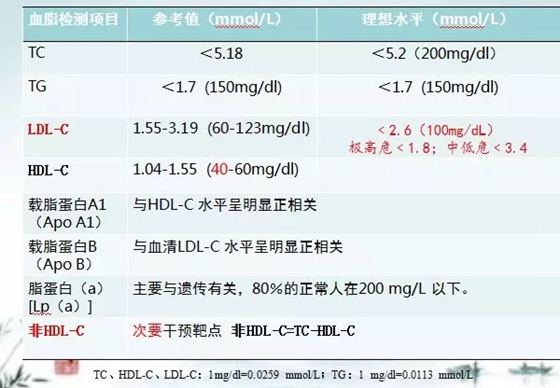 LDL-C :低密度脂蛋白胆固醇。它是一种“坏胆固醇”,它可以把血液中的胆固醇搬运至血管内壁,堆积形成“动脉粥样硬化”。由于胆固醇是LDL的主要组成成分,所以一般情况下LDL-C和TC是相平行的,但TC还会受到HDL-C水平影响,大量研究也证实LDL-C是影响心脑血管疾病的最主要危险的因素,所以目前各大指南及临床工作中,都把LDL-C作为治疗的首要干预靶点及主要评估指标。而HDL-C:高密度脂蛋白胆固醇。它就是我们所说的“好胆固醇”,它可以把沉积下来的胆固醇清除后运送出血管壁,帮助血管恢复弹性。