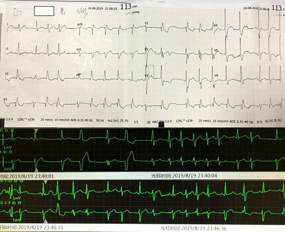 8月19日晚,今年56岁的王大叔受邀到朋友家做客,朋友特地拿来一坛新买的“药酒”来招待他,可这酒一喝就觉得不太对劲,两人只喝了大概一两就感到嘴唇、舌头发麻,于是不敢再喝了。 吃完饭后,王大叔骑车回家。到家后不久,感到恶心难受呕吐了一次,随后感到双手也麻了起来,慢慢的全身都感到麻麻的没有了力气,家人赶紧带他驱车赶往湘雅常德医院。快到医院时,王大叔感到气喘、全身麻木,送到急救室时,呼吸越来越急促,一查生命体征:心率快至135次/分,呼吸快至30/分,平日120-130/60mmHg的血压现在也只有108/56mmHg。接诊医生一看心电监护心里一咯噔:频发室早!床旁心电图一做不但频发室早还有短暂室速,马上给予药物治疗,短暂的室速得到了控制,但时不时的有多源多形的室性早搏出现。 患者心电图及心电示波