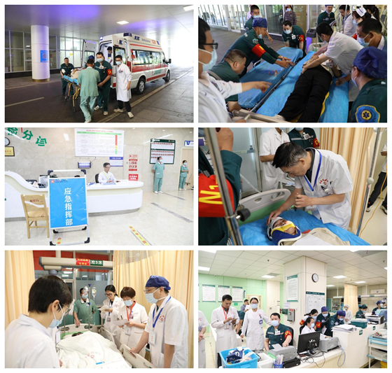 本次演练真实模拟某路段发生公交车侧翻致数人受伤事故场景,模拟事故造成6名“伤员”,包括1人死亡、4人重伤、1人轻伤。急诊分诊台接警确认后,医务人员按照突发公共事件流程,及时启动应急预案,逐层汇报,奔赴事故地点进行救援。救援人员到达现场后,立即进行现场检伤分类、危重患者抢救、外伤现场救治、伤者及时转运。各部门参与人员从实战角度出发,反应迅速、调度有序、配合密切、秩序井然、抢救措施得当。
