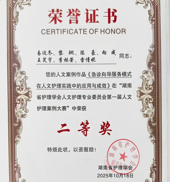 10月17日至19日,湖南省护理学会人文护理专业委员会学术年会暨第一届人文护理案例大赛在长沙市顺利举行。湘雅常德医院急诊科团队凭借《急诊向导服务模式在人文护理实践中的应用与成效》案例,从全省众多作品中脱颖而出,荣获二等奖,并受邀在大会现场作优秀案例分享,获专家与同行高度赞誉。