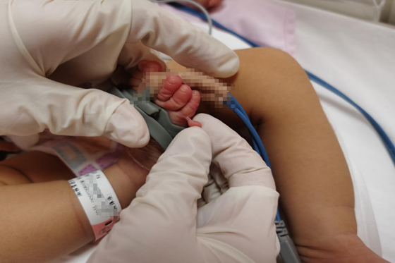 近日,湘雅常德医院新生儿科收治了一名从产科转入的患儿,该患儿被诊断为新生儿高胆红素血症,在检查全身时发现在右足小趾外侧长有一个约为5毫米大小的肉赘,其没有和骨头连接,经诊断为皮肤赘生物。管床医生考虑到随着患儿年龄增加,赘生物可能会不断增大,赘生物基底部也会相应增粗,所以提出能否在住院期间进行摘除。在与患儿家属沟通获得同意后新生儿科立即联系普外科对其进行会诊,普外科医生评估后表示可以进行摘除,还表示如果等皮肤赘生物变大了可能会使手术难度增加,甚至需要麻醉,并容易留有瘢痕,影响体表美观,现在正是摘除的好时机。