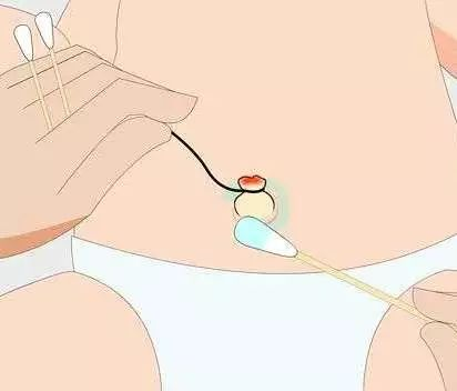 3.一手轻轻提起宝宝脐带的结扎线,另一只手用络合碘或酒精棉签以脐带根部到脐带再到周围皮肤的先后顺序来擦拭,每擦拭一个部位需更换一支新的消毒棉签。