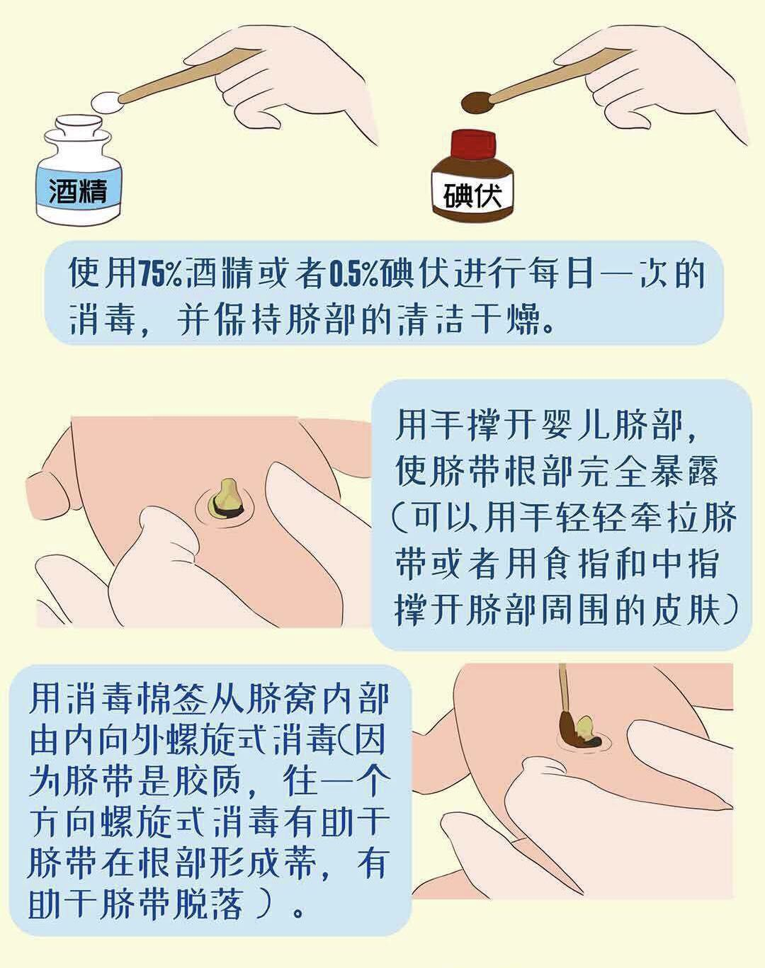 P.s.每日彻底清洁消毒脐部1-2次,直至脱落。脐带脱落后,继续用消毒剂消毒脐轮周围,直至分泌物消失。