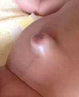 脐疝为少量腹腔内脏器在腹压增高时经脐环疝出,民间习惯称为“气肚脐”。是最常见的一种脐部疾病,表现在哭吵、咳嗽、排便时脐部出现圆形或卵圆形突出包块,安静或平卧后包块消失,脐部皮肤松弛。