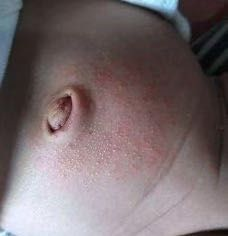 是因过敏因素引起肚脐周围皮肤的皮疹,表现为丘疹、糜烂、渗出及脱屑等,可以用1-4%硼酸液外洗,涂氧化锌油。