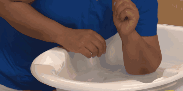 5.宝宝的小手小脚也要清洗干净。轻轻地从上而下的清洗宝宝的小手和小脚,肉肉多一点的宝宝要注意关节和褶皱处。