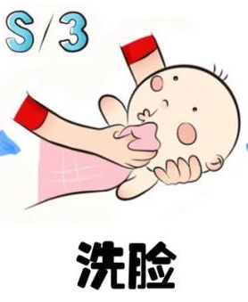 2. 先不用把宝宝的小衣服脱掉,避免受凉,先将宝宝的两只腿用我们的一侧手臂夹紧,同侧的手掌托住宝宝的头部,另一只手用沾湿的小毛巾一角轻轻擦拭宝宝的眼晴(注意是由内而外噢!)。然后依次清洁宝宝的鼻子、嘴巴及整个面部。