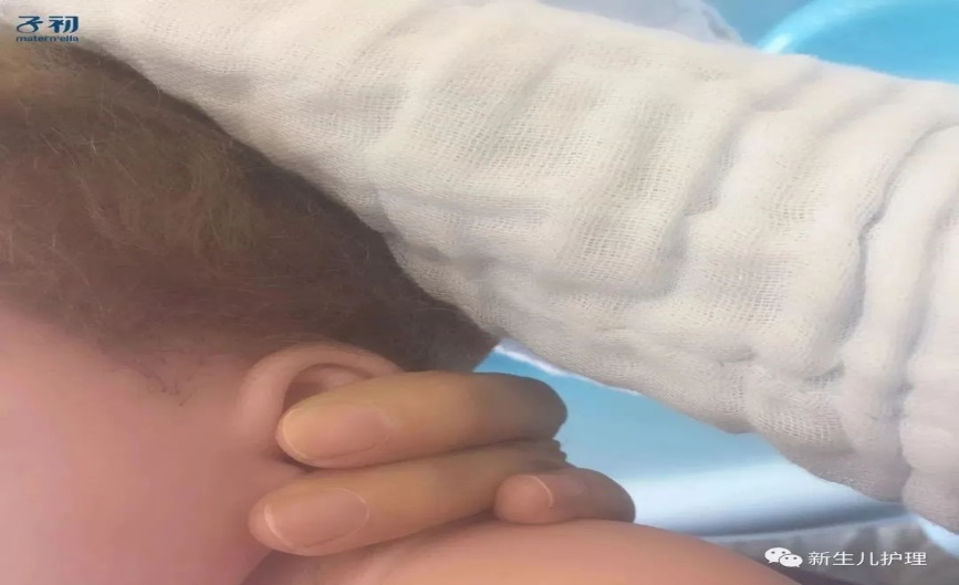 3. 接下来我们就开始给宝宝洗头发,先用我们的大拇指和食指将宝宝的小耳朵轻轻反折盖住外耳道(避免有水流进小耳朵哟),用小毛巾沾水让头发湿润,用少许婴儿专用洗发沐浴露或者不用(用沐浴露时要注意别弄进宝宝的眼睛咯!),轻轻按摩揉洗;然后用水冲洗干净,用毛巾擦干。