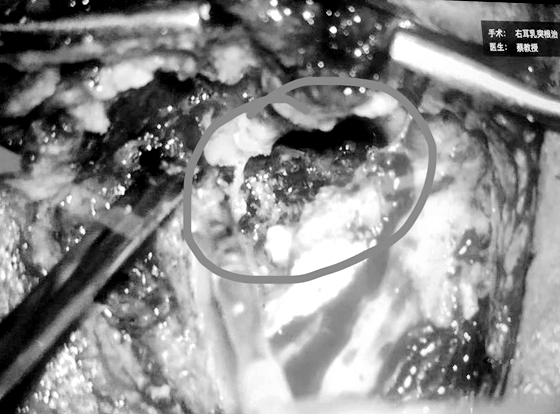 之后,田湘娥教授为其制定了详细的手术计划。次日,在全麻下通过显微镜为其实施了“右乳突根治术”。术中发现:右中耳内见巨大胆脂瘤,乳突骨质及外耳道后壁、上壁骨质破坏,约1.5cm×1cm大小面积硬脑膜裸露,外半规管骨质破坏,可见蓝线,病变鼓膜内陷贴附于鼓室粘膜,听骨链完全消失,咽鼓管鼓口、鼓室内大量胆脂瘤上皮。面神经骨管水平段及垂直均破坏,面神经裸露。在完全没有正常解剖结构作为标志的情况下,耳鼻喉科专家根据术前严密阅片,仅1个半小时,凭借部分已经破坏的残余结构迅速定位并保护好面神经、脑膜等重要结构,彻底清除了胆脂瘤病变及其基膜,充分轮廓化及通畅引流术腔。手术取得成功,术后患者无眩晕、无面瘫症状,次日便下床正常活动。