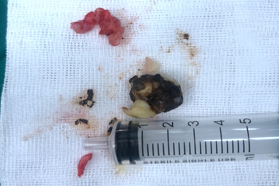 当天,孙文主治医师在局麻下为李先生实施了颞部脓肿切开引流术,术中抽出黄色粘稠恶臭脓液约60ml。冲洗过程中发现脓肿通过破坏的后壁与外耳道直接相通,整个外耳道后壁塌陷。予以抗感染+反复冲洗换药治疗一周后,患者脓肿消退,切排引流口已无明显分泌物流出。