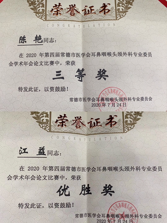 大会选举湘雅常德医院耳鼻咽喉头颈外科孙文副主任医师当选为常德市医学会耳鼻咽喉头颈外科专业委员会副主任委员,邓海华主治医师、罗志彬医师当选为青委委员,贾文彬护士长当选为护理学会五官专业委员会常务委员。陈艳医师题为“以突聋伴眩晕为首发症状的脑梗死1例并文献复习”获学术年会论文比赛三等奖,江益主管护师题为“碳酸氢钠液对不同外耳道冲洗的浸泡时间探索”获学术年会论文比赛优胜奖。