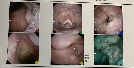 田湘娥教授详细了解患者病情后,立即为其行电子纤维喉镜检查,一查便知:喉部广泛新生物。喉部肿物已累及其双侧声带、室带、杓会厌皱襞、会厌喉面结构,双侧颈部也发现多发肿大淋巴结。原来,困扰宋大伯四个多月的“感冒”竟是因喉部多发肿物引起。