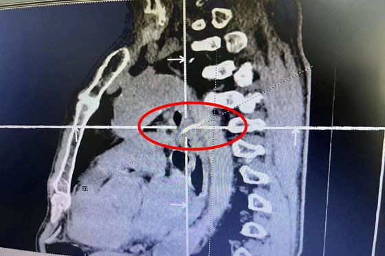 在取得患者及家属同意后,当日立刻为患者进行急诊手术,术中见食管内一弓形鱼刺卡顿,左侧穿出食管壁,可见明显搏动。
