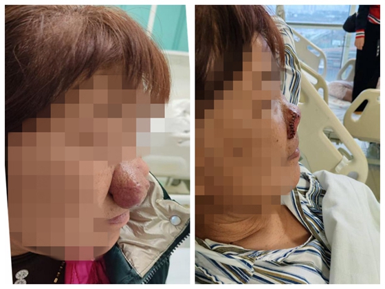 来自湖南常德的肖女士多年来一直被一个巨大的紫红鼻子困扰,这个异常的肿块已经存在了六年,并且在最近两年内显著增大至约5厘米,严重影响了她的生活质量和自信心。由于肿块不仅影响了她的容貌,还带来了明显的异物感,肖女士遂前往当地医院寻求帮助,当地医院建议她转至上级医院进一步治疗。于是,肖女士选择来到湘雅常德医院耳鼻咽喉头颈外科进行治疗。