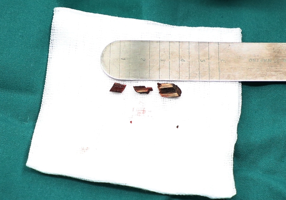 “左眼眶内有树枝残渣,要赶紧手术。”据湘雅常德医院眼科主任许雪亮教授介绍,患者来就诊时意识清醒,视力尚可,但伤口处化脓严重,如不尽快取出,极易造成感染,导致整个眼眶内形成脓瘤。据了解,刘先生左眼眶内所残留的树渣形态极小,只有利用磁共振才能检测出残渣的大体位置。最终,在许雪亮教授团队共同努力下,经过近两个小时的手术,刘先生左眼眶内的树枝残渣被成功取出。后经医护人员测量,3块残渣大小均为1厘米。