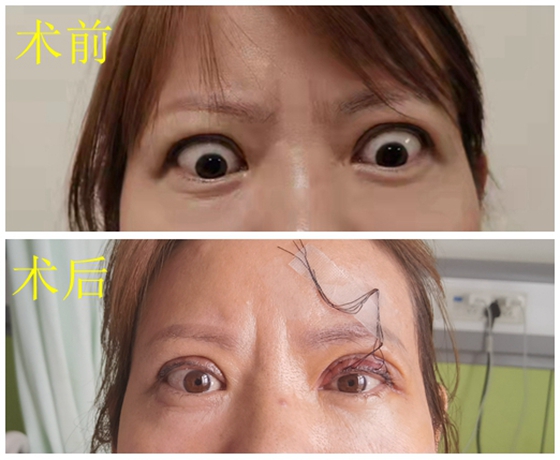 陈女士辗转省内多家医院,最后在朋友推荐下来到湘雅常德医院眼科找到许雪亮教授。经过详细评估及患者诉求,许雪亮教授团队决定给患者行眼提上睑肌延长术,以达到改善患者外观和提高患者生活质量的目的。9月7日,经过许雪亮教授及其团队的共同努力,手术获得成功,达到预期目的。患者术后上睑退缩表现明显好转。
