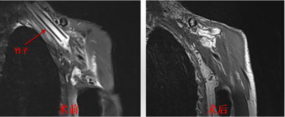 在反复仔细询问患者受伤及后续治疗病史后,完善相关检查,对病情进行全面评估后,确定从腋窝插入的“竹子”深入颈胸部,位于锁骨下方,锁骨下动脉及肺尖旁。根据患者实际情况,由整形美容烧伤皮肤科李连楚主任医师主刀,在全麻下为患者行左颈胸部清创探查异物取出术。全麻插管后,沿左腋部窦道口至颈胸部竹子插入方向进行切开,仔细探查,避开锁骨下动脉及周边神经,发现“竹子”,成功予以取出,异物为新鲜竹子断端,末端齐整,直径约1厘米,长约8厘米,再次仔细探查确定无残余异物后,反复清洗伤口窦道,放置引流管,予以修复封闭伤口,历时3个小时,完全取出“罪魁祸首”。术后安返病房,在医护团队精心治疗下,最终康复出院。