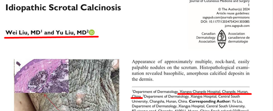 湘雅常德医院皮肤科团队创作的一篇罕见病例研究文献在国际知名期刊《Journal of Cutaneous Medicine and Surgery》(JCR Q1区,IF3.9)上发表,题目为《Idiopathic Scrotal Calcinosis》,该文献主要论述研究皮肤科领域的罕见疾病——特发性阴囊钙质沉着症,湘雅常德医院皮肤科刘薇为第一作者。