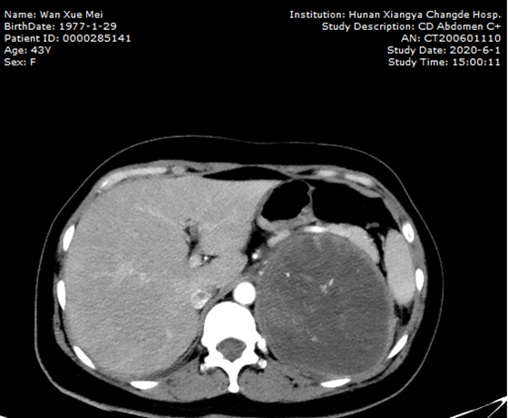 43岁的万女士因左侧腰腹痛1年,加重伴发热,慕名来到湘雅常德医院泌尿外科就诊。万女士曾经有过两次剖宫产经历,入院后完善相关辅助检查后显示:左侧肾上腺区有一个巨型肿瘤。那么,这也就意味着左侧肾上腺恶性病变的可能性极大,且极有可能导致皮质癌。术前经过科室讨论及与患者充分沟通后,泌尿外科团队决定为其实施“经腹入路腹腔镜下左侧腹膜后巨大病损切除术”。