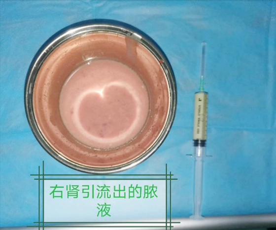 入院后顿金庚主任及结石组组长陈旭东副主任医师、朱敏主治医师及时查看了患者并详细讨论病情,发现患者精神状态差,有发热、右侧肾区叩痛,血象高;结合CT阅片,考虑右肾很可能化脓,随时可能发生感染性休克危及生命,需急诊手术。同时,因为患者高龄、合并“冠心病房颤、肺气肿及肺部感染”等多种基础疾病且服用过抗凝血药物,心肺功能及耐受力差,麻醉风险大等,决定实施局麻下肾造瘘术。术中彩超精准定位“一针见脓”,造瘘管引流出大量乳白色粘稠脓液。考虑患者肾积脓,为防止发生感染性休克,不宜一期手术取石。手术过程中,患者配合良好无特殊不适,生命体征稳定。老大爷手术后当天就恢复了正常饮食和活动!