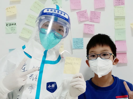 羞涩的孩子给我们的不仅是最纯粹的感谢,还是我们进舱前的勇气、工作时的动力、疲惫时的抚慰。回病区,我找到他说:“姐姐也希望你健康快乐地成长!战胜病毒,早点回家!”当询问他要不要合影,他开心的点点头,于是有了这张珍贵的合影。