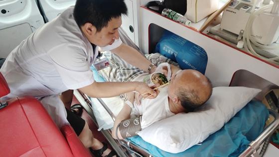 早餐点心、米饭茶水、量体温、测血压……救护车上,仍然能够看到谭旭副主任医师为患者忙碌的身影。8月21日14时35分,闫先生被安全护送到家。