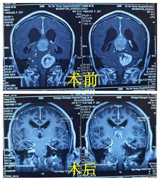 家属因担心手术风险大从而选择了放疗。在第12次放疗时,小杨突然神志昏迷,随即诊断为急性梗阻性脑积水,在急诊行脑室外引流后小杨神志逐渐恢复。小杨母亲担心接下来的放疗还会存在难以预料的隐患,经多发打听后,慕得袁贤瑞教授之名,遂来到我院决定行手术治疗。