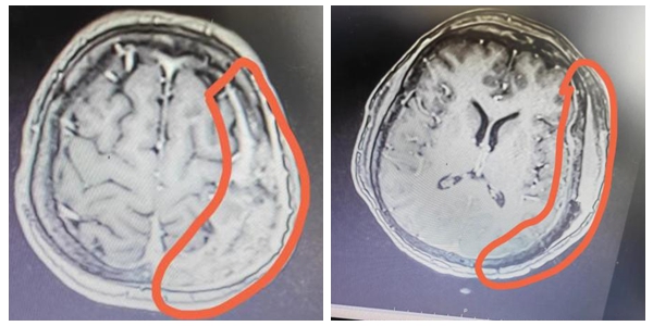 近日,我院神经外科来了一位头上有"犄角"的患者。50多岁的刘女士四个月前在梳妆打扮时,偶然发现左侧头顶有一小块凸起,不痛不痒,未引起重视。直到凸起越长越大,刘女士才到湘雅常德医院就诊。 手术前后对比图 入院后,头颅MRI显示:左侧顶骨可见弥漫性骨质破坏,建议手术切除。术中,发现患者颅骨被肿瘤侵犯约12*12cm大小,约8*10cm大小硬脑膜被肿瘤浸润,肿瘤长入左顶叶与脑组织黏连,予轻柔剥离,肿瘤全切。术后患者恢复良好,病理诊断:脑恶性肿瘤(左顶骨转移癌)。 有些朋友可能会无意间摸到自己的脑袋上长出了大包,因为不痛不痒,不以为然,其实脑袋上长包不能掉以轻心,尤其是对于有原发恶性肿瘤的患者。当头上长包的时候,排除外伤因素,对于有原发恶性肿瘤的患者(文中患者刘女士既往有宫颈癌病史),要高度警惕是否原发恶性肿瘤骨转移!如果患者触摸到自己头部长包,需要及时到专业医院请专科医生进行诊治。 神经外科袁贤瑞主任提醒大家:颅骨骨瘤是一种隆凸于骨面的肿瘤,多累及颅骨和下颌骨,严重时可由颅骨浸润入颅内。头上长肿块千万别忽视,如果肿瘤生长迅速,要及时就医,防止肿块的进一步增长,侵犯脑组织,避免造成不可逆的后果。特别是有原发恶性肿瘤的患者,不要小看身上一些不疼不痒、看似不影响功能的小包块,往往可能隐藏着大麻烦。如果发现身上突然长出了不明包块,要注意观察其大小和形状的变化及生长的速度,一旦出现异常要及时就医,及时明确病因,把握最佳的时机对症治疗,只要治疗及时,预后效果还是比较好的。