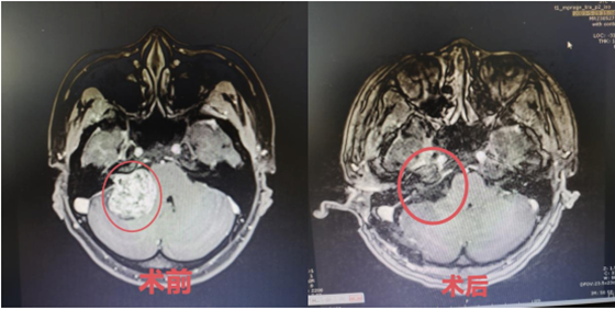 由于胡女士术前已有明显神经功能障碍,手术刻不容缓,在完善相关术前准备后,以袁贤瑞教授为主刀的神经外科团队为患者在显微镜下实行:听神经瘤切除术。术中,由于肿瘤体积大,约4*3cm,与三叉神经、面听神经及后阻神经均有粘连,其中面神经更是被压迫得薄如蝉翼,与肿瘤界面难以区分,其中任一神经出现问题,都有可能面临面瘫、面部疼痛麻木、声音嘶哑及吞咽困难等症状。再加上肿瘤本身与脑干关系密切,稍有不慎,患者极有可能出现偏瘫甚至死亡的风险。好在袁教授凭借精湛的手术技巧和丰富的临床经验,在全切肿瘤的同时,顺利保住了患者的面神经和听神经。术后胡女士无任何面瘫,听力也较术前明显好转,近日已康复出院。