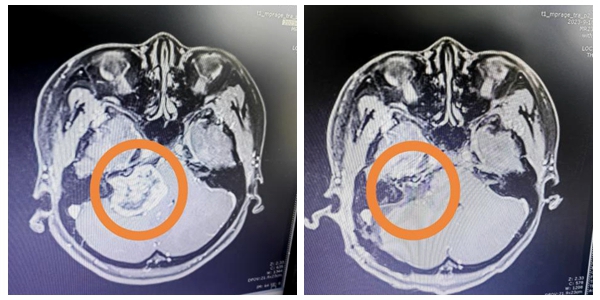32岁的彭女士于3年前出现耳鸣,最近自觉头晕不适,右侧听力下降伴吞咽困难,在当地行头部增强磁共振提示:右侧桥小脑区占位,约5cm大小,考虑为巨大听神经瘤。由于该脑肿瘤手术风险大,当地医院无法独立完成,需要请省级医院专家手术。患者考虑到手术风险,犹豫不决遂出院。后来,患者多方打听了解到袁贤瑞主任是国内外颅底肿瘤手术的顶级专家,慕名来湘雅常德医院就诊。
