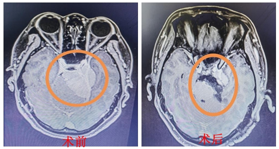 近日,湘雅常德医院神经外科团队成功为来自山东的王女士切除6*5.5*5.2cm大小的巨大岩斜坡区脑膜瘤。