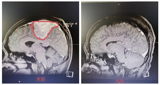 家住桃源县的杨先生,1年多前感觉右腿总是抽筋伴无力,呈阵发性。近几个月,杨先生右脚感觉减退,脚趾及脚掌上抬困难,偶尔右脚发作性震颤,后续发展到逐渐行走不稳,家人慌了神,便带着他到当地医院就诊,行头颅MRI示:左顶部上矢状窦巨大占位,约60*44mm,肿瘤位于左侧额顶部,累及运动区,肿瘤充满上矢状窦,血运丰富,周围出现大面积水肿。