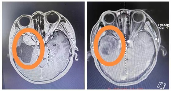 湘雅常德医院神经外科团队为李女士完善了相关检查,发现李女士右侧颞叶囊实性占位性病变,实性成分约32*19mm大小,囊性成分约74*53mm大小。