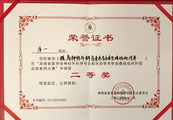 近年来,湘雅常德医院护理部多次邀请省内外专家对护理人员进行专业知识的培训,多次举办了健康科普、临床护理实践案例竞赛等专业赛事,更好地提升了护理人员的专业能力。此次获奖,不仅是对我院护理工作开展的肯定,也是对神经外科护理团队专业素养及临床决策能力的充分肯定。在未来,神经外科将继续在护理部的领导和关怀下,加强专业知识的培养,加强医学人文关怀,增进医患沟通,改善患者的就医体验,构建和谐医患关系,提升医疗护理质量,提升人民群众就医获得感和满意度,谱写医院高质量发展的新篇章!