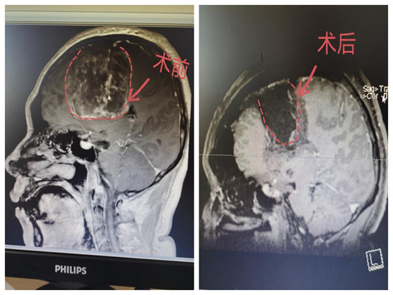 当天下午,神经外科主任袁贤瑞教授查房后,认为患者肿瘤巨大,将近10cm且位于功能区,脑室受压明显变窄形成脑疝,病人情况危急需紧急手术。取得家属同意并完善相关术前检查之后,袁贤瑞教授团队立即对患者进行“幕上深部病变切除术”,手术中利用黄荧光技术显影肿瘤,并在电生理监测下,历时7个小时,最终实行肿瘤全切,无损伤,无残留,神经功能也完美保留,且左肢体偏瘫较术前明显改善。