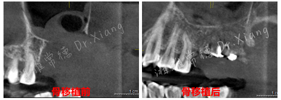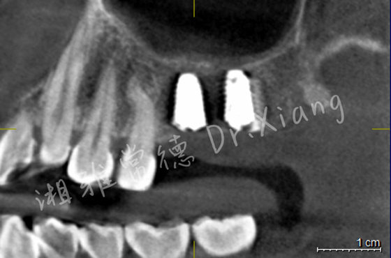 经过9个月骨愈合后,患者复查锥形束CT,骨愈合十分满意。9月中旬,向峰医师种植团队成功为患者实施了第二步的手术,取出内固定装置的同时为患者成功微创的植入2枚种植体,完成了患者左上颌区域的软硬组织的自然恢复和改建。