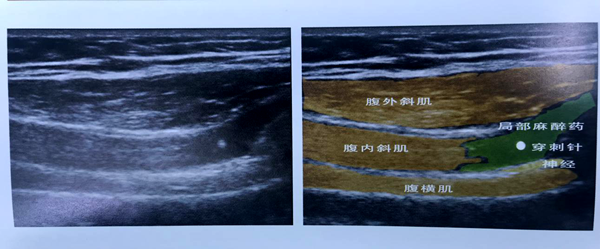 7月30日一早,患者入室后,常规心电、血压、脉搏氧饱和度监测,开放输液通路后,孙志华主任、曾覃遥主治医生、徐霞医生组成的麻醉团队为患者顺利实施了超声引导下使用长效局麻药对左侧髂腹股沟-髂腹下神经的阻滞。手术开始后,为消除患者紧张,术中泵入少量镇静药物,患者生命体征平稳,镇痛肌松效果好,外科手术进行非常顺利。术后访视患者,患者表示不但术中无痛,甚至术后第一天麻醉药还减轻了伤口的疼痛,对麻醉医生给与了高度的赞扬。