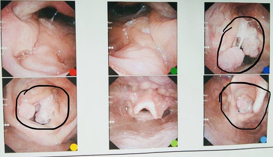 那术前提前在局麻下行气管切开是否可行?可是喉乳头状瘤本来就具备极易复发的特点,一旦气管切开形成创面后,瘤子将会种植到创面周围,形成更多更大的瘤子,所以不到万不得已不会进行这一步。最终经过讨论,孙志华主任决定对小彭实施清醒气管插管,并备好气切设备,随时做好气切的准备。