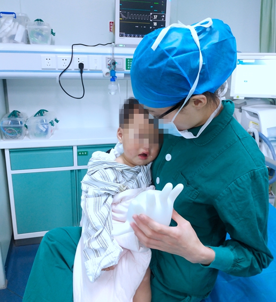 随着麻醉药物逐渐代谢排出,吸痰、拔管后,患儿的意识慢慢恢复,朦胧中感觉到了陌生气息,于是开始哭闹,嘴里含糊不清的喊着妈妈。出于女性本能的母爱,为了安抚孩子的情绪,向艳霞将患儿抱了起来,将事先临时绘制的海绵宝宝拿了出来,并拿出手机播放小猪佩奇。患儿对这个特别造型的海绵宝宝感兴趣,很快的就安静下来了。同事们开玩笑说“艳霞,你身上有妈妈的味道,孩子一下子就不哭了!”。