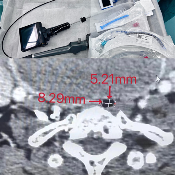 据了解,患者有着30余年甲状腺肿大病史,因各种原因一直未予处理,平时有呼吸困难,影响进食,晚上睡觉无法平躺,难以入睡。李阿姨的气管受巨大甲状腺肿块的压迫,最狭窄处仅5.2mm,而成年人气管内径正常值为:15~20mm,并且气管软骨环长期受压存在软化的风险。此次患者如果进行常规麻醉主要存在两种风险:一是由于气管受压移位,气管导管通过困难;二是麻醉诱导后气管塌陷,通气困难导致患者缺氧窒息,所以麻醉风险极高。