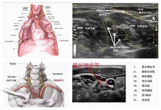 由于膈神经和星状神经节在人体的颈前部,此处密布丰富的动静脉血管及重要神经,还临近气管、甲状腺、肺部等重要器官,操作风险很大。随着医学影像学的快速发展,B超引导下膈神经与星状神经节阻滞术能够通过超声影像实时、动态地观察颈部内部组织结构,准确定位膈神经与星状神经节,提高治疗安全系数,大大降低了出现并发症的危险性。同时治疗药物准确的集中到需治疗的神经周围,往往也预示着更优的疗效。