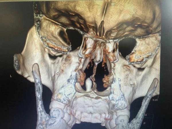 在湘雅常德医院耳鼻喉头颈外科,经过尹秀兰主任医师仔细检查,发现齐先生右侧鼻腔有个坚硬的白色异物,将异物表面的脏东西清理干净后才发现,鼻腔内的白色异物居然是一颗牙齿。经鼻窦CT检查后明显可以看到鼻腔内有一颗白色的牙齿已经从牙槽骨内完全向鼻腔生长出来。